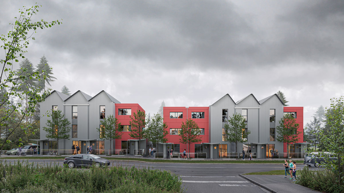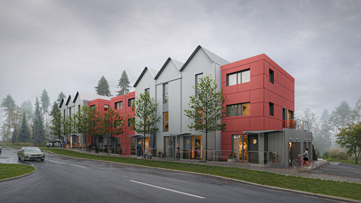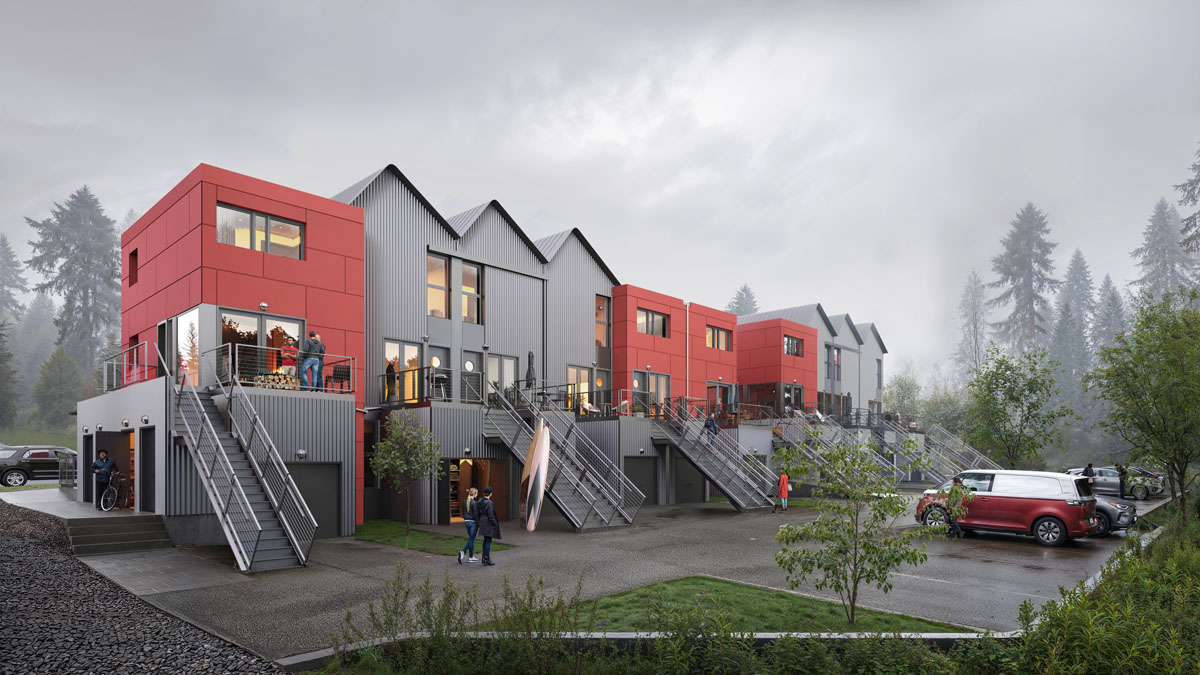 Resort towns like Tofino have a core challenge of creating housing for residents working in their community. The design for a half acre parcel in central Tofino is intended to help address this with a combination of 400 square foot ground level apartments with 800 square foot townhouses above. A total of ten of each unit type is proposed. Two units will go to the Tofino Housing Corporation.